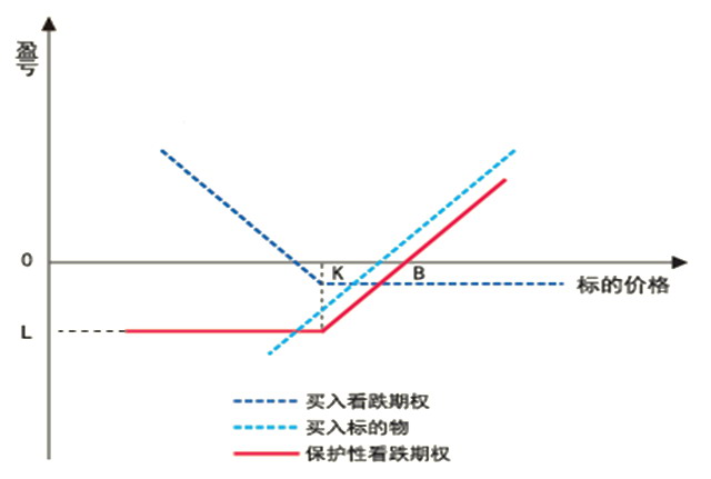 图为保护性看跌期权策略(L为亏损,K为行权价,B为盈亏平衡点,下同)