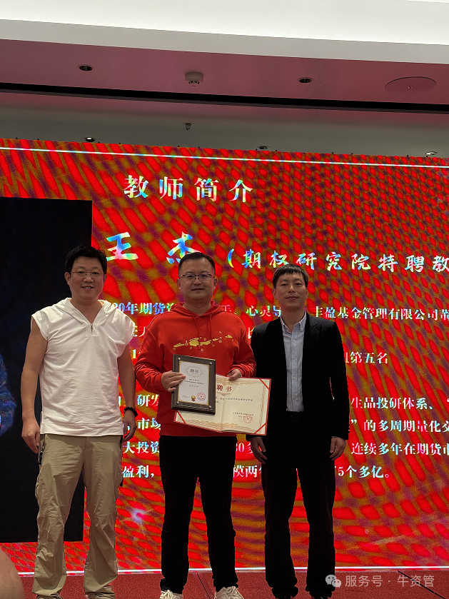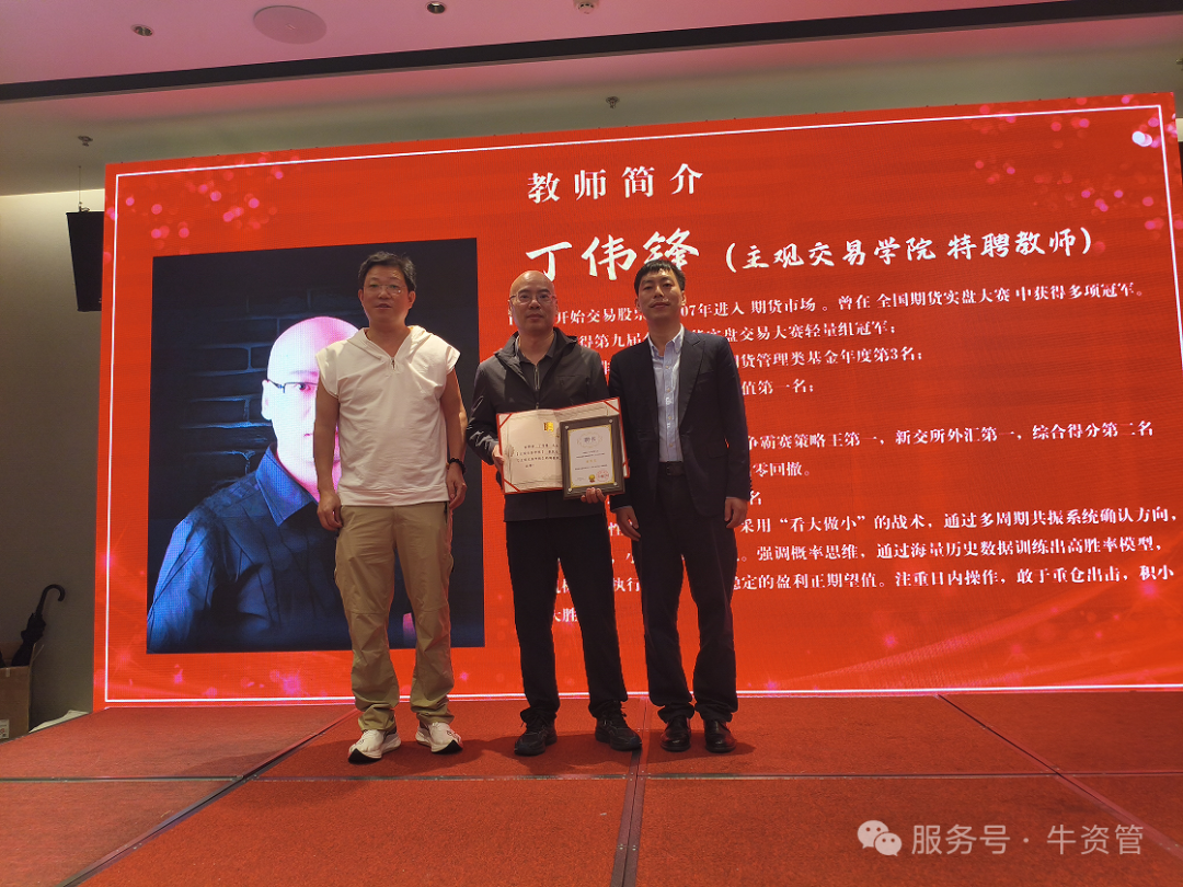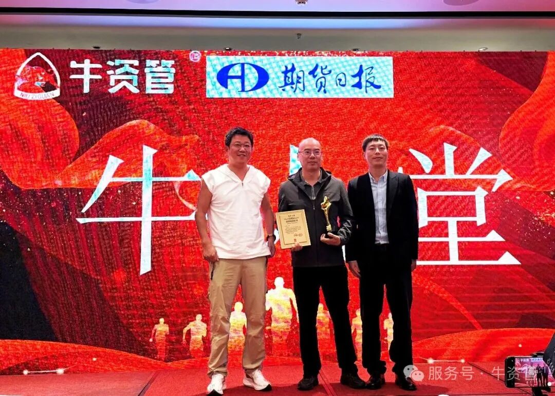 主题演讲结束以后即举行了“牛人堂”牛人入驻仪式。“牛人堂”是光荣与梦想的殿堂,是荣耀和尊贵的象征。由牛资管董事长姜承州先生和新湖期货零售事业总部总经理金阳先生为第五位入选者丁伟锋颁发“牛人堂”奖杯及纪念证书,并合影留念,记录这一美好时刻。